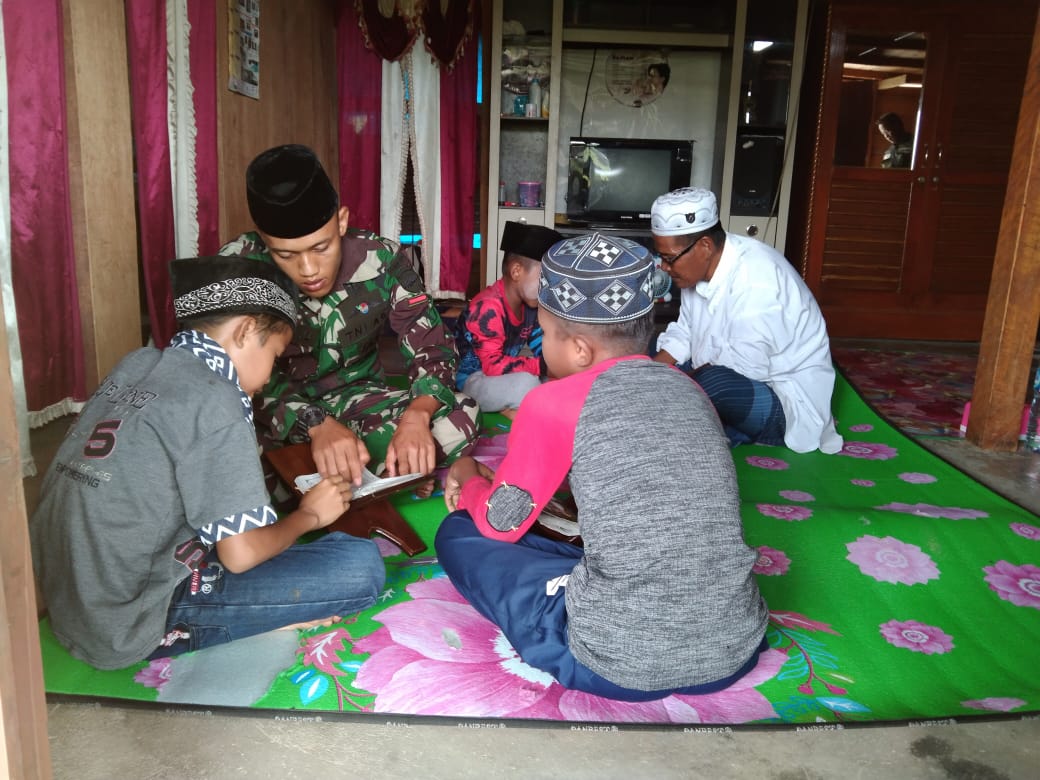 Seperti yang dilaksanakan oleh Prada Arif yang tergabung didalam Satgas TMMD Ke- 110 melaksanakan kegiatan Non Fisik dengan cara mengajar mengaji kepada anak- anak yang berada dilingkungan kerja dalam pembuatan Semenisasi, tepatnya terletak di Desa Koto Ruang, Kecamatan Rokan IV Koto, Kabupaten Rokan Hulu, Provinsi Riau, Sabtu (06/03/2021).