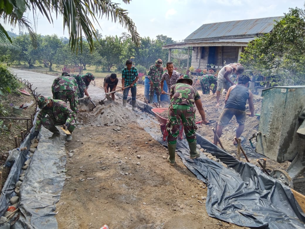 Rokan Hulu,reportaseindonesia.id | Satgas TMMD Ke- 110 bersinergi dengan masyarakat dalam melaksanakan pengerjaan pembuatan jalan semenisasi di Rt 01 / Rw 06 Dusun Koto Ingin Desa Koto Ruang, kecamatan Rokan IV Koto, Kabupaten Rokan Hulu, Selasa (9/3/2021).