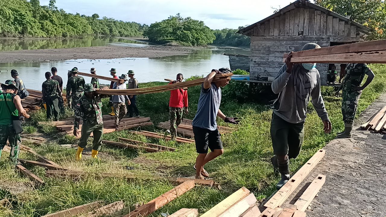 “Medan sulit serta menyebrangi sungai untuk menuju tempat sasaran rumah yang berada diseberang sungai, tidak menyulitkan personil satgas TMMD yang bantu masyarakat dalam pelangsiran material bahan bangunan ini.