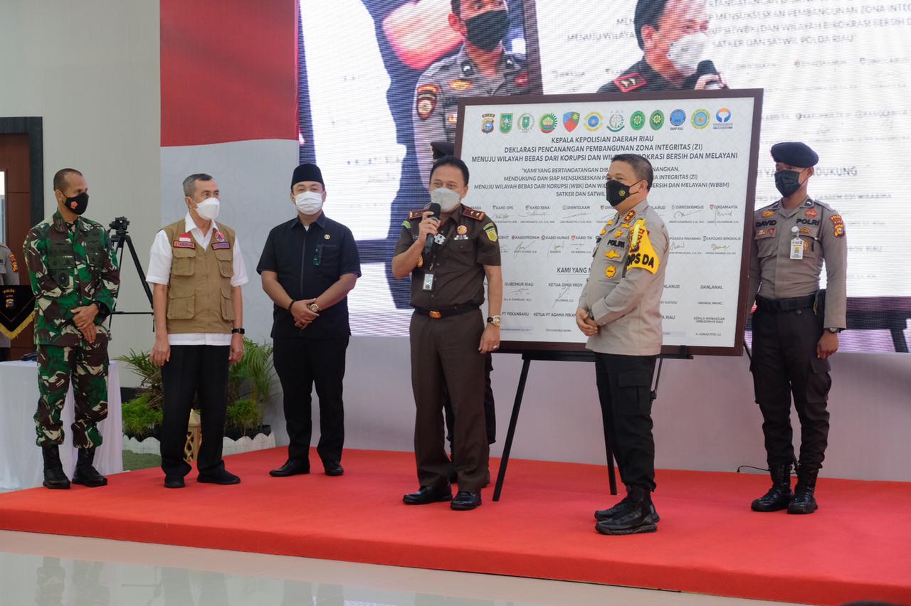 Pekanbaru, reportaseindonesia.id | Kapolda Riau, Irjen Pol Agung Setya Imam Effendi deklarasikan Pencanangan Pembangunan Zona Integrasi (ZI) menuju Wilayah Bebas dari Korupsi (WBK) bagi 15 Satker dan Wilayah Birokrasi Bersih Melayani (WBBM) bagi 2 Satwil. Kegiatan ini diadakan di Aula Tribrata Lantai 5 Mapolda Riau Jalan Pattimura no. 13 Kota Pekanbaru pada Kamis siang (22/04/2021).
