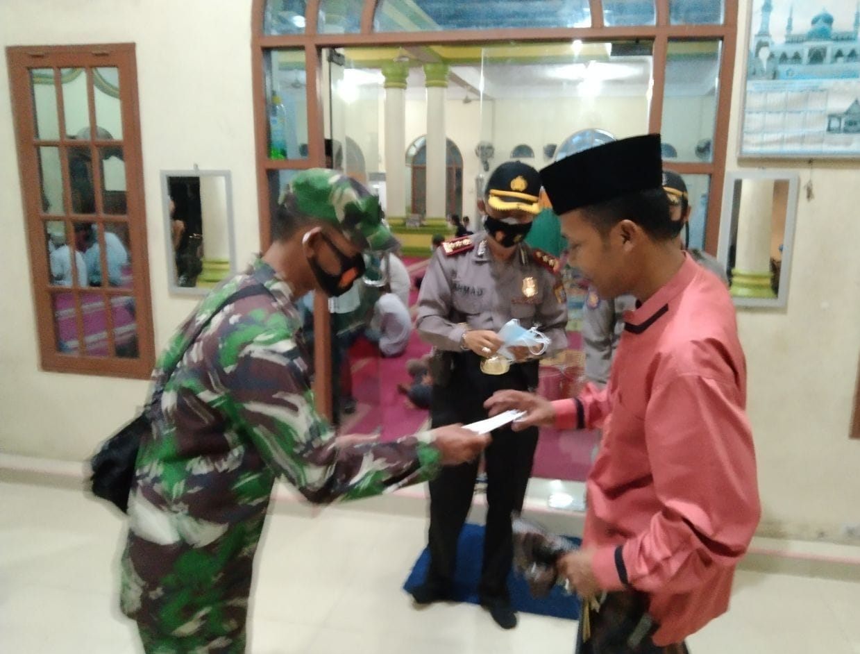 Selain mengajak masyarakat untuk mematuhi Protokol Kesehatan, Sertu Nurhajis bersama tim gabungan juga memberikan Masker kepada jemaah saat akan menjalankan sholat Tarawih.
