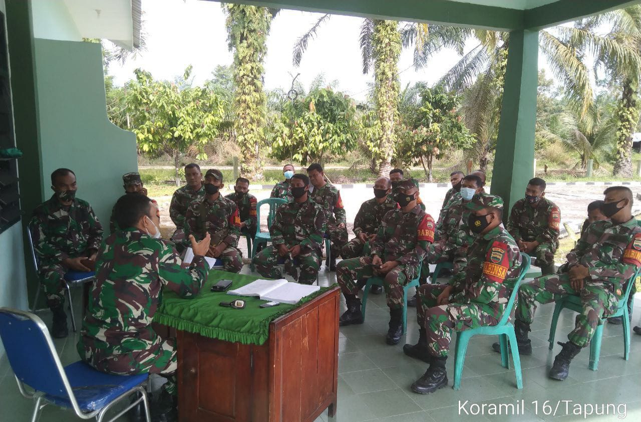 Kampar, reportaseindonesia.id | Sebagai bentuk penerapan disiplin dalam hal pengawasan terhadap para anggotanya, Danramil 16/Tapung Kodim 0313/Kampar, Kapten Inf Taufik Sihombing memberikan pengarahan/Jam Komandan kepada seluruh anggota, bertempat di Kantor Makoramil 16/Tapung Jl. Lintas Petapahan-Suram Desa Petapahan, Kecamatan Tapung , Kabupaten Kampar, Provinsi Riau, Kamis (3/6/2021).