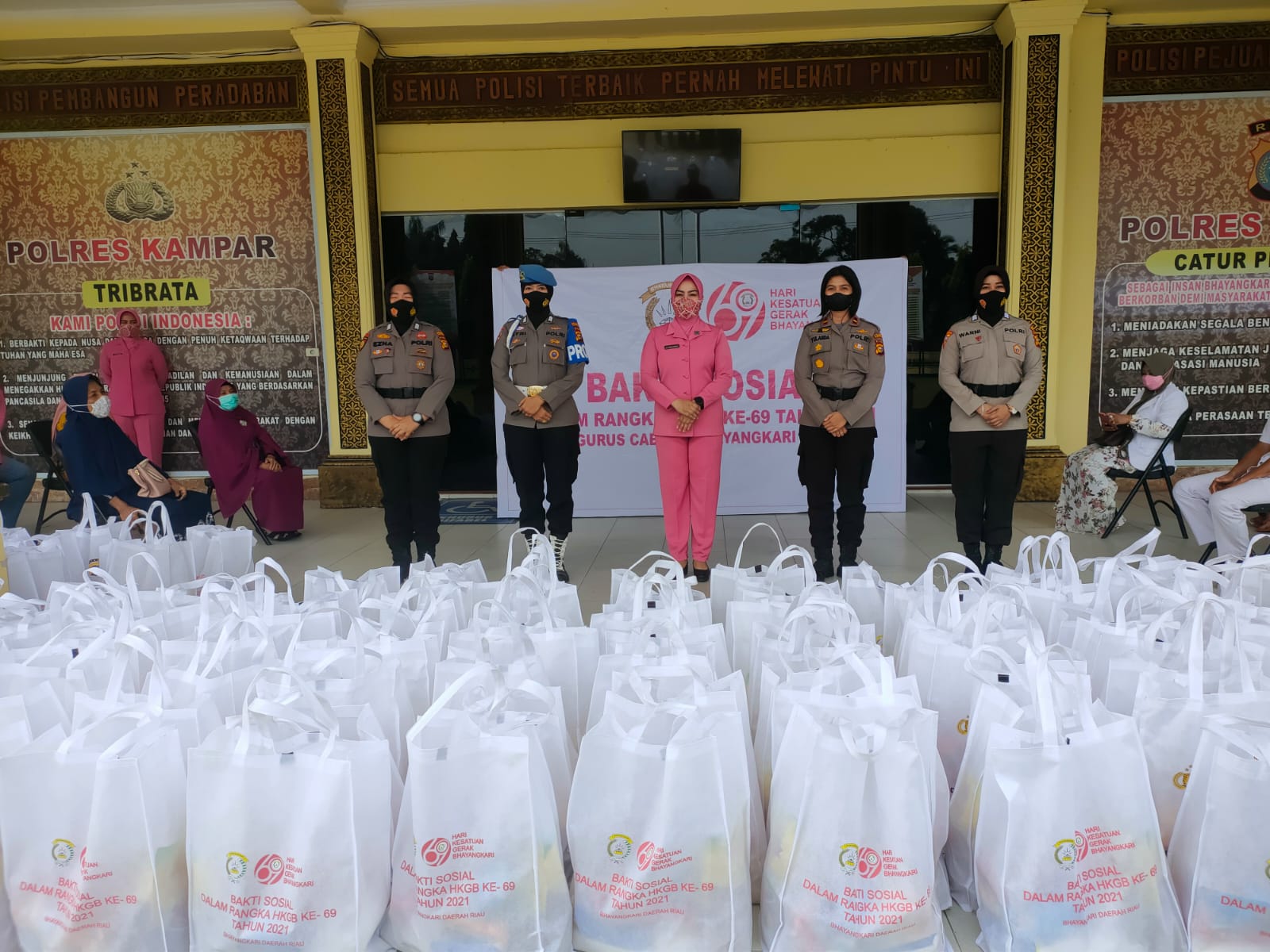 Kampar, reportaseindonesia.id |Dalam rangka memperingati Hari Kesatuan Gerak Bhayangkari (HKGB) ke-69 dan Hari Jadi Polisi Wanita (Polwan) ke-73, dilaksanakan Pendistribusian Bansos dari Bhayangkari Cabang Kampar dan dari Polwan Polres Kampar, yang digelar pada Senin pagi (19/07/2021) sekira pukul 09.00 Wib diteras depan Mapolres Kampar.