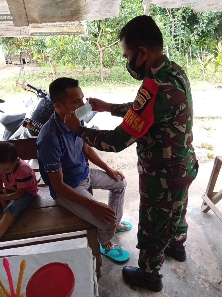 Babinsa Koramil 12/XIII Koto Kampar Himbau Tetap Pakai Masker Pada Warga Desa Bandur Picak