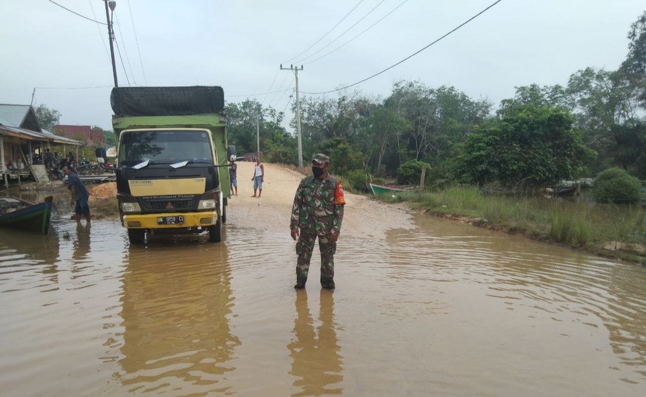 Babinsa Koramil 04/PKL Kuras Kodim 0313/Kpr Serda Ahmad Basahil melaksanakan sambang dan kontrol jalan serta pemukiman warga yang kena dampak banjir di Desa Lubuk kembang bunga (25/10/2021).