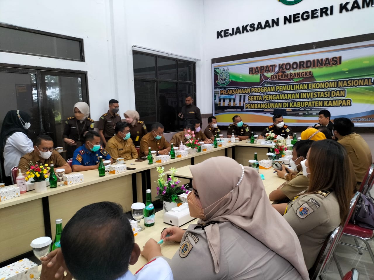 Kampar, reportaseindonesia.id |Berdasarkan perintah harian Jaksa Agung Republik Indonesia, Kejaksaan Negeri (Kejari) Kampar menggelar rapat koordinasi bersama Organisasi Perangkat Daerah (OPD) dan BPN dalam rangka program pemulihan ekonomi, pengaman investasi serta pembangunan di Kabupaten Kampar, bertempat di Aula Kejari Kampar, Provinsi Riau, Senin (27/12/2021).