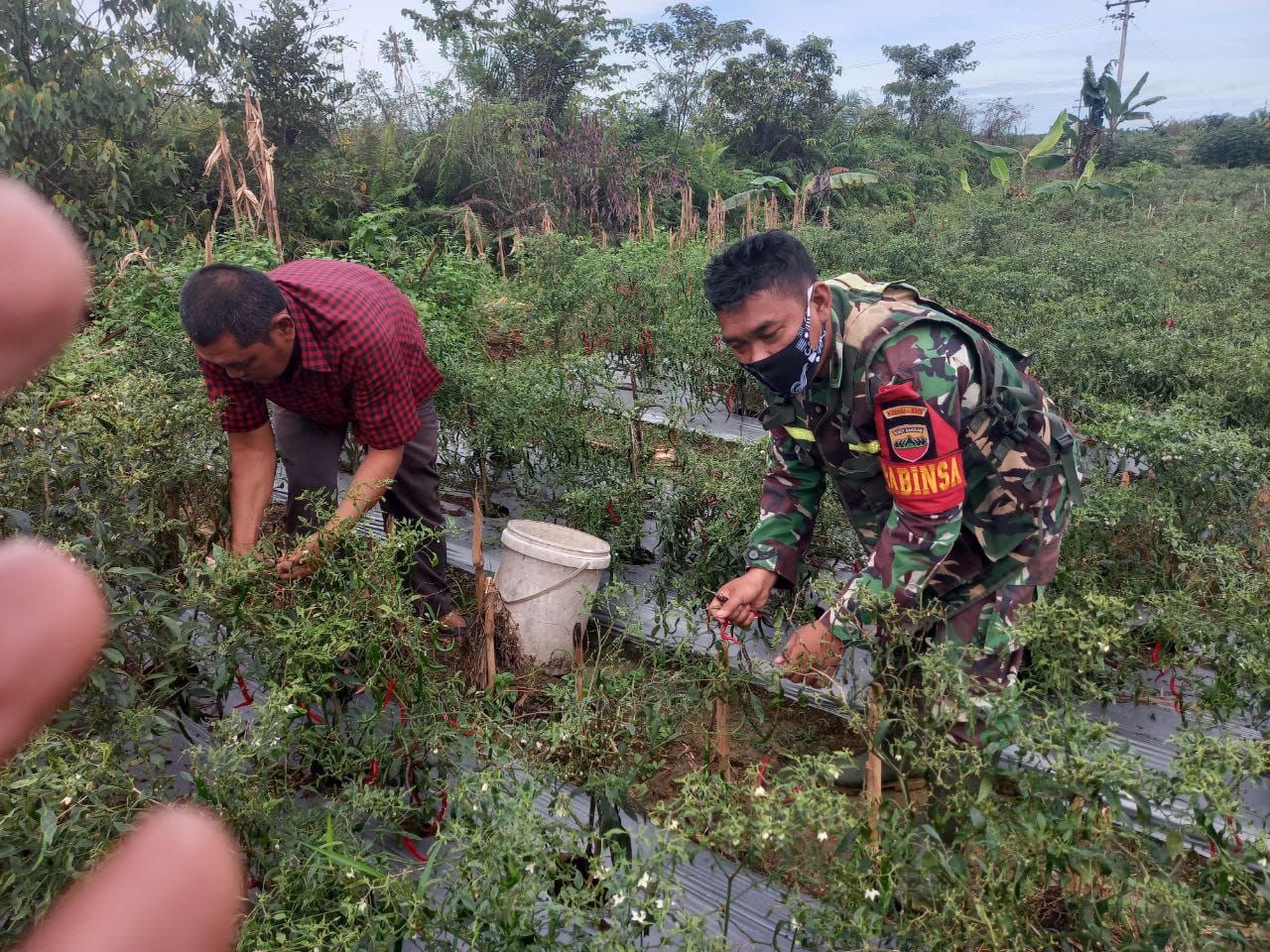 “Hari ini kita lakukan pendampingan dengan mengecek tumbuh kembang tanaman sekaligus diajak oleh bapak Usman untuk memanen cabe yang cukup umur untuk dipanen,” ucap Babinsa.