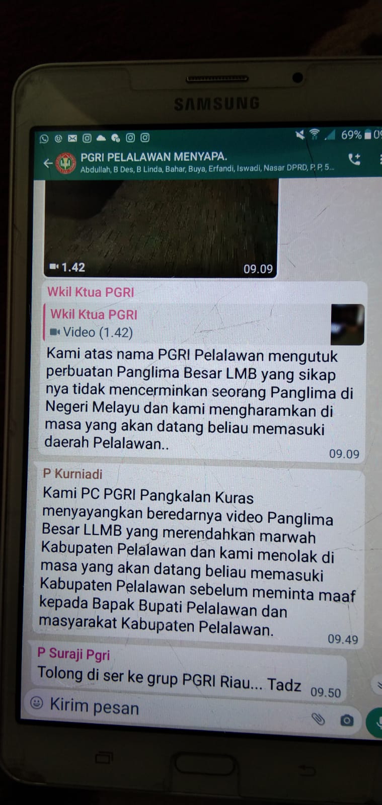 Kami atas nama PGRI Pelalawan mengutuk perbuatan Panglima Besar LMB yang sikapnya tidak mencerminkan seorang Panglima di Negeri Melayu.