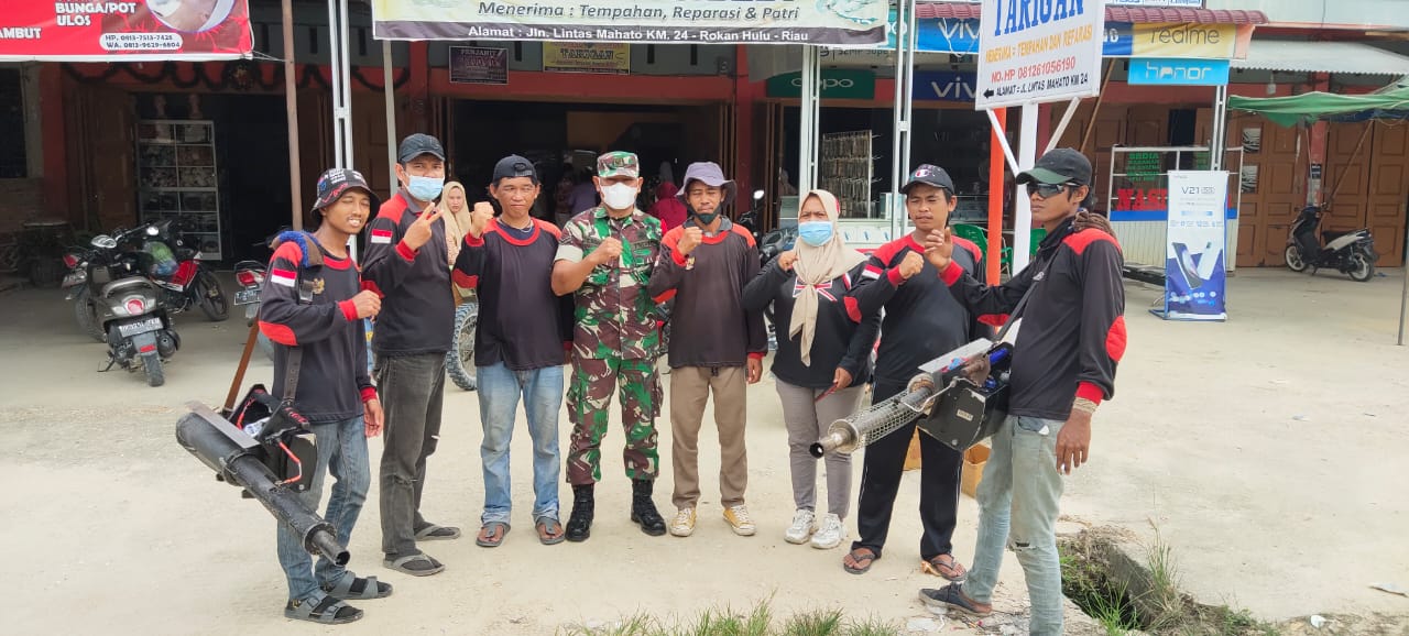 Suatu cara dalam pencegahan sejak dini penyakit Demam berdarah dengue (DBD) dan pencegahan varian baru omnicron, Babinsa dan tim relawan Fogging melakukan penyemprotan fooging dan cairan disinfektan di desa Mahato Kec.Tambusai Utara Kab.Rokan Hulu (Riau). Selasa (01/02/2022)
