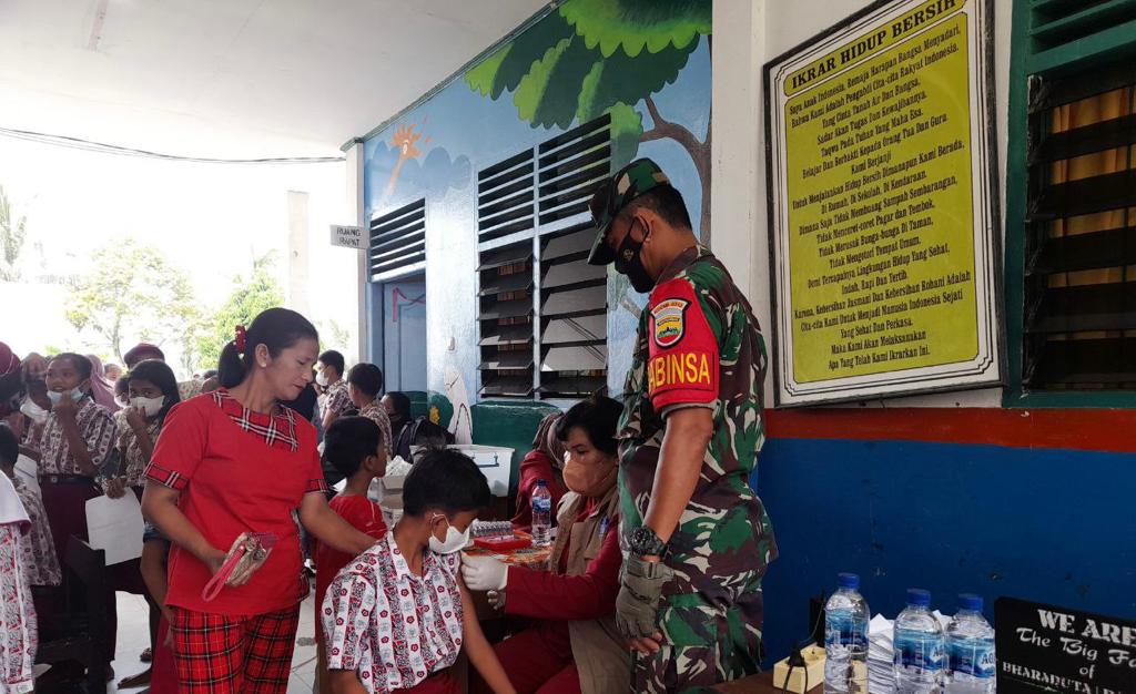 Babinsa Terus Dukung dan Dampingi Vaksinasi Covid-19 di SDN Permata Ukui