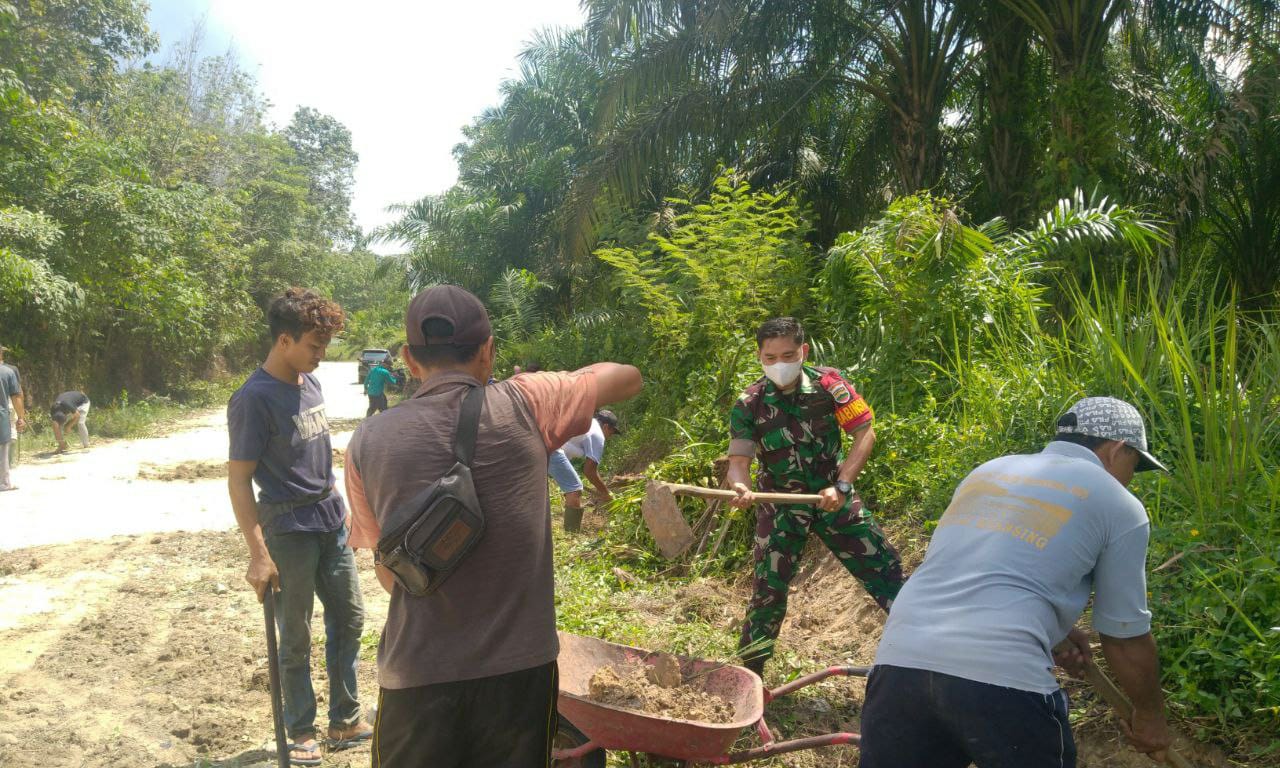 Sebagai seorang aparat teritorial, Babinsa selalu hadir ditengah-tengah masyarakat bergotong royong bersama warga seperti dilakukan Sertu Hermanto dalam bergotong royong membersihkan parit dan penimbunan jalan yang berlubang serta membersihan rumput liar yang tumbuh di kiri kanan jalan.
