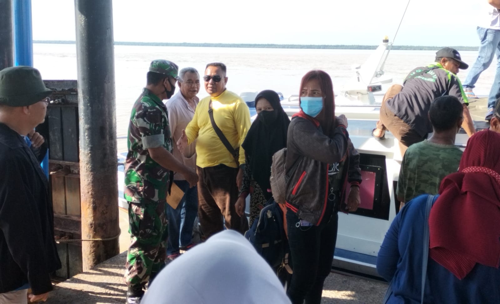 Pelalawan, reportaseindonesia.id |Babinsa Koramil 15/KK Sertu Hendra Gunaan bersama Relawan Covid -19 melaksanakan penegakkan disiplin protokol kesehatan dan pengecekkan suhu tubuh (PPKM mikro) oleh Tim Satuan Tugas Kec. Kuala Kampar kepada para penumpang Speed Boad tujuan Selat Panajang di Pos Covid-19 Pelabuhan Penyalai Kel. Teluk Dalam Kec. Kuala Kampar Kab. Pelalawan, Selasa (21/6/2022).