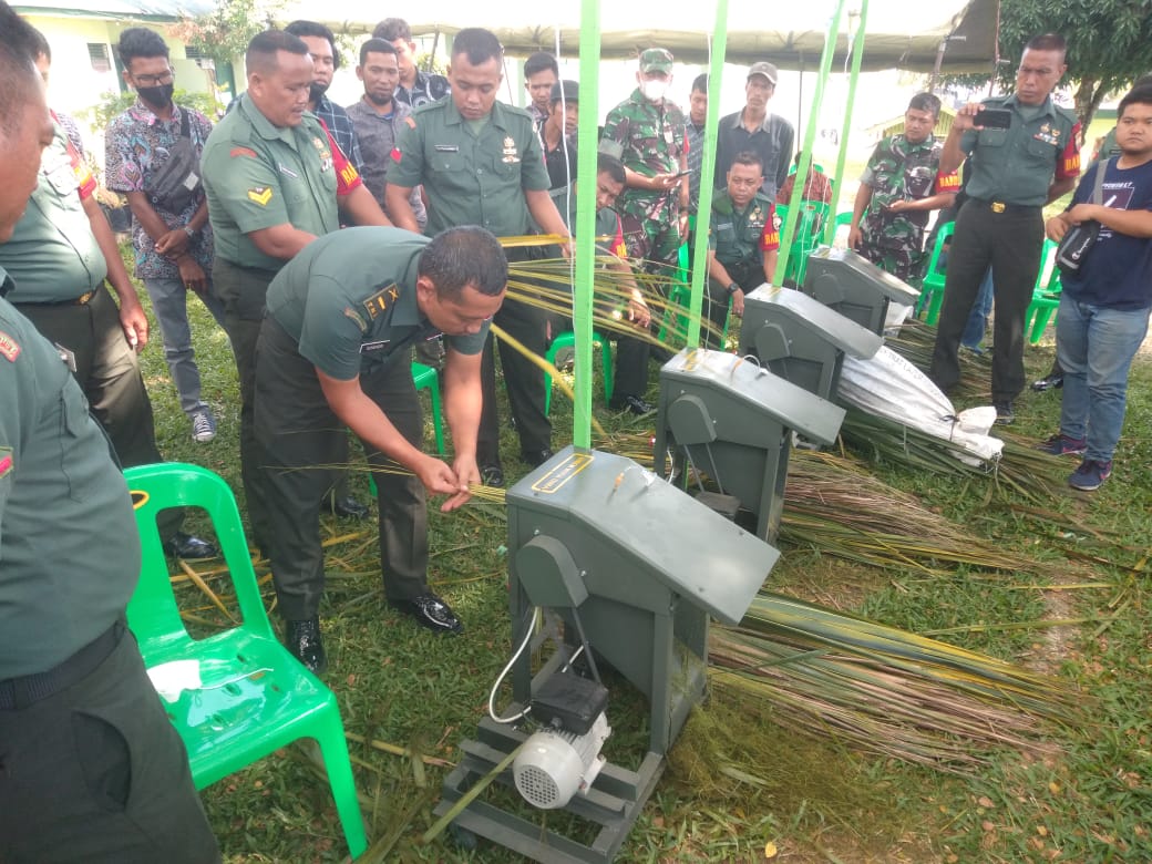 Sebelum dilakukan penyerahan mesin sapu lidi kepada Babinsa dan masyarakat diberikan pelatihan penggunaan serta pembuatan lidi sehingga para masyarakat mengetahui cara pengunaan mesin serut lidi tersebut, terang Perwira Seksi Logistik, Kapten Inf Devi Edward.