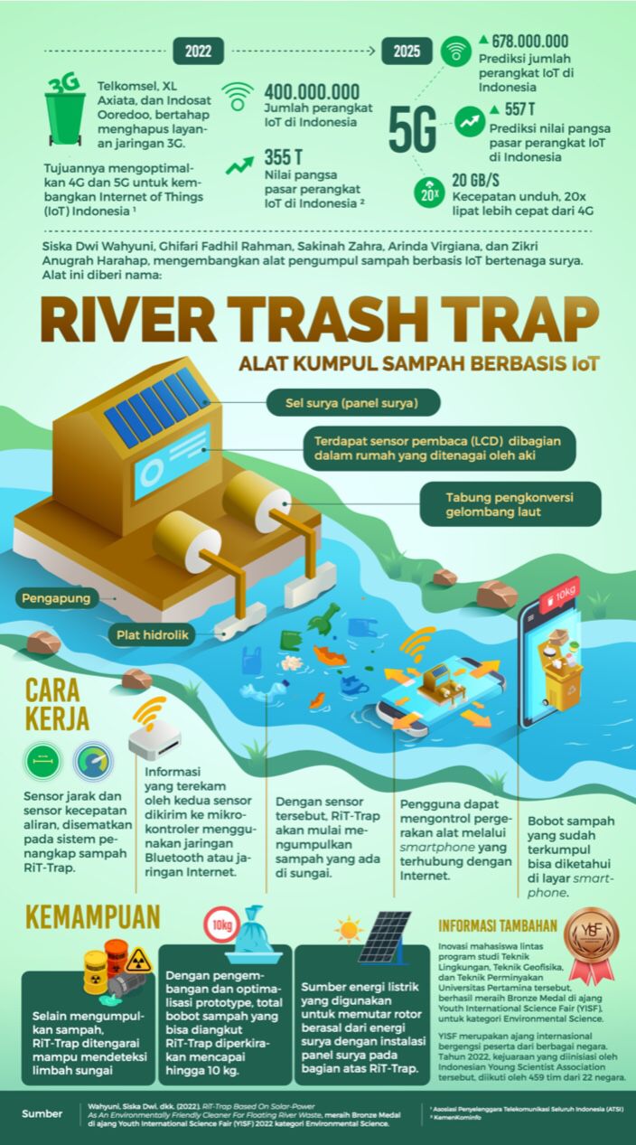 Mahasiswa Universitas Pertamina (UPER) ambil peran dalam pengembangan perangkat IoT. Siska Dwi Wahyuni, Ghifari Fadhil Rahman, Sakinah Zahra, Arinda Virgiana, dan Zikri Anugrah Harahap, berinisiatif mengembangkan alat pengumpul sampah berbasis IoT bertenaga surya. Alat ini diberi nama River Trash Trap (RiT-Trap).