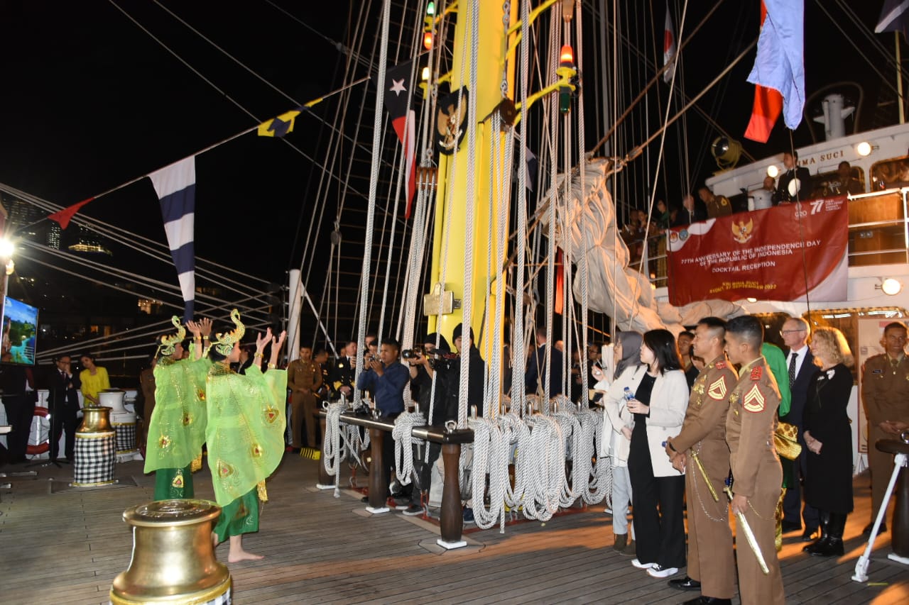 Dihari ketiga sandar di Australia, Selasa (13/9), KRI Bima Suci dengan Komandan Letkol Laut (P) M. Sati Lubis, S.T, M.Sc., CHRMP., menggelar Cocktail Party yang berlangsung di atas KRI Bima Suci dengan menampilkan berbagai tarian dan hidangan khas Indonesia.