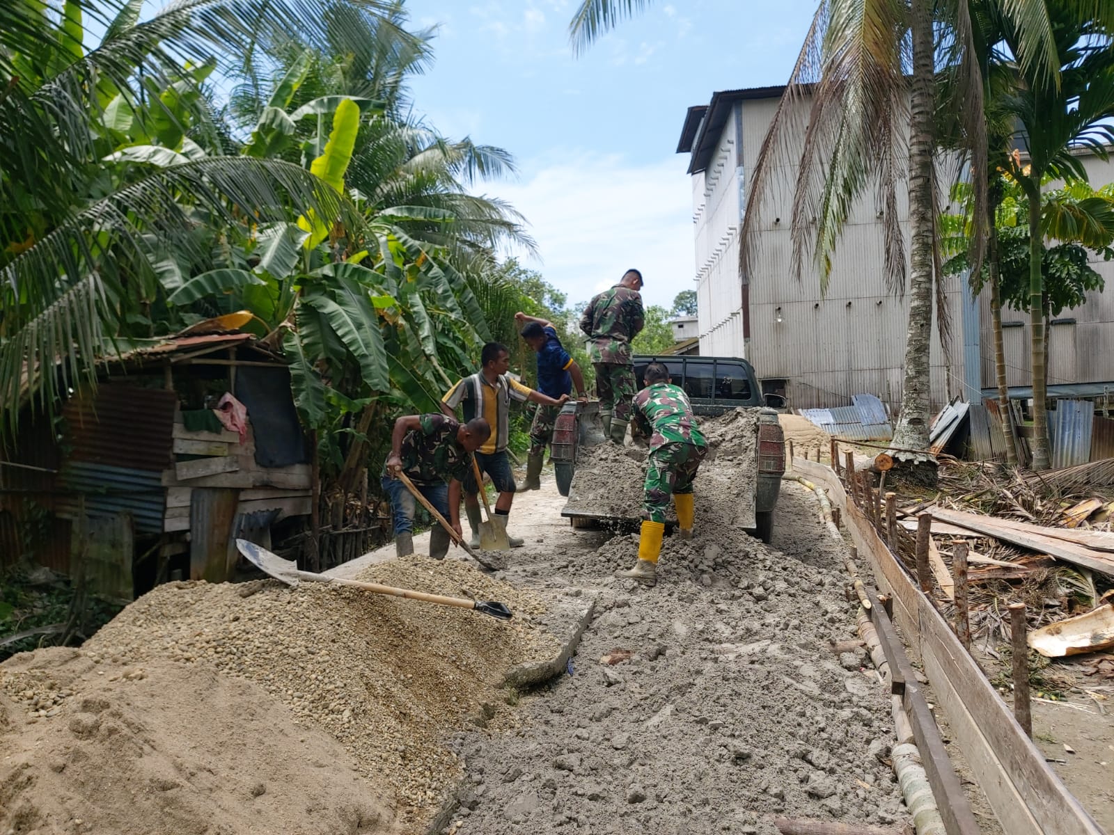 “ Saat ini Satgas TMMD terus memastikan pasokan pasir tak terhambat, dengan menggunakan Satgas TMMD terus memasok material pasir tersebut, agar pembangunan sasaran fisik dan lainya berjalan lancar, ” kata Kapten Inf Hendra P. Barus Selaku Dan SSK. Terangya