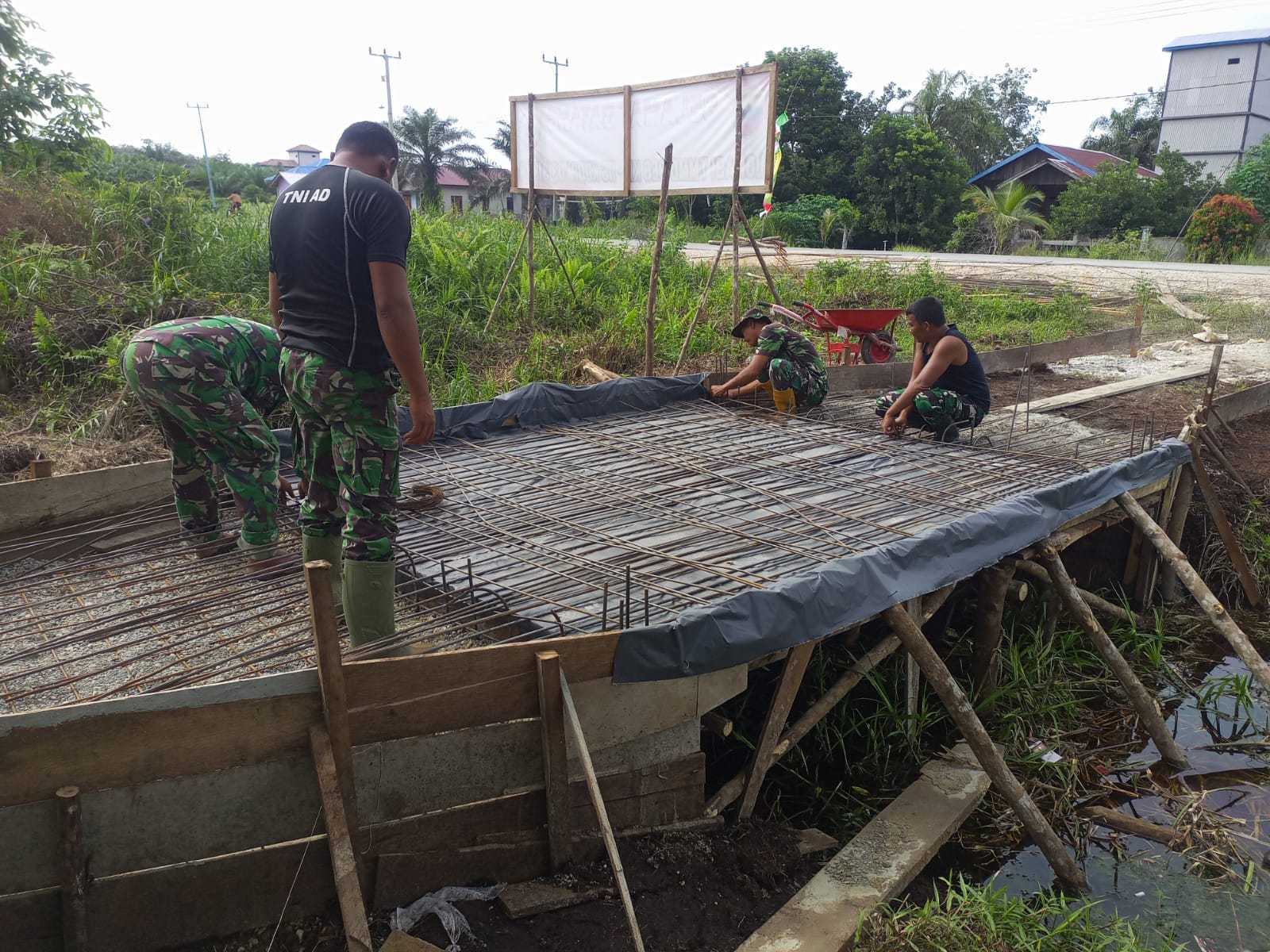Pelalawan, reportaseindonesia.id | Satgas TNI Manunggal Membangun Desa (TMMD) Ke-115 Kodim 0313/Kpr bersama warga kembali lankutkan pekerjaan rangkai besi cor untuk jembatan dengan ukuran 3×6 Meter di RT /14 RW /07 Dusun Teluk Punak Kelurahan Teluk Meranti, Kecamatan Teluk Meranti, Kabupaten Pelalawan, Kamis (27/10/2022).