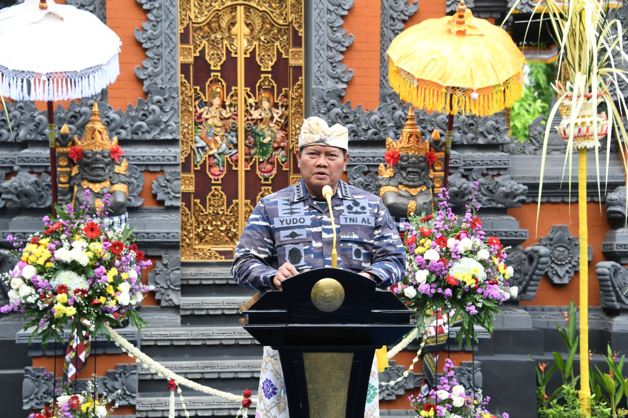 Laksamana TNI Yudo Margono terlihat sangat berkarisma yang hadir dengan mengenakan Pakaian Seragam TNI AL dipadu dengan balutan udeng dan saput yang menjadi ciri khas pakaian ibadah umat Hindu.