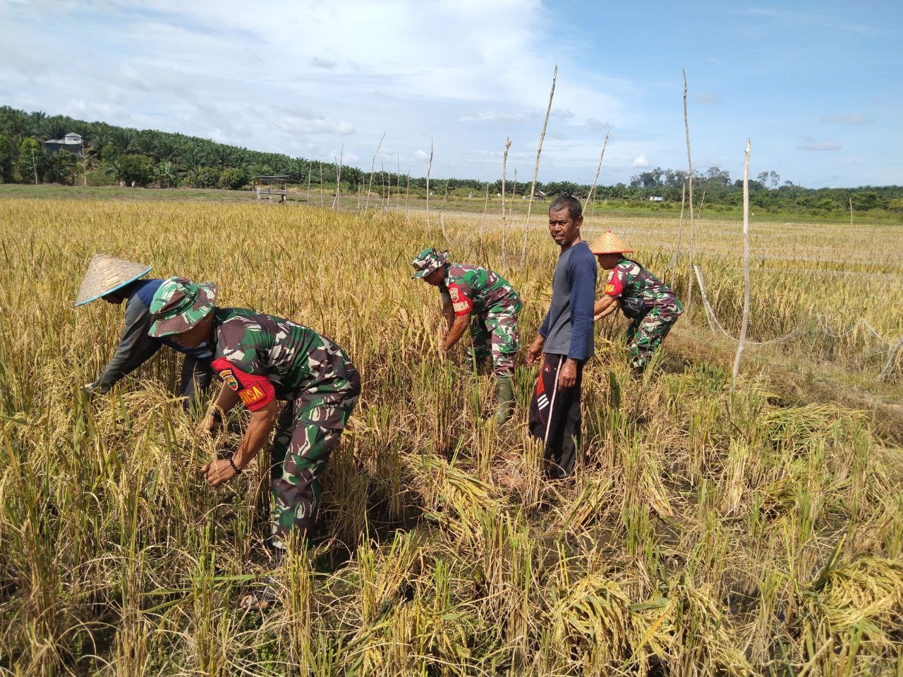 Wujud dukungan TNI khususnya prajurit kewilayahan yaitu Babinsa dalam mendukung ketahanan pangan, dengan Semangat ikut serta terjun langsung ke sawah bantu para petani desa binaannya saat memanen padi, inilah yang dilakukan oleh Babinsa kepada para petani di desa binaannya.