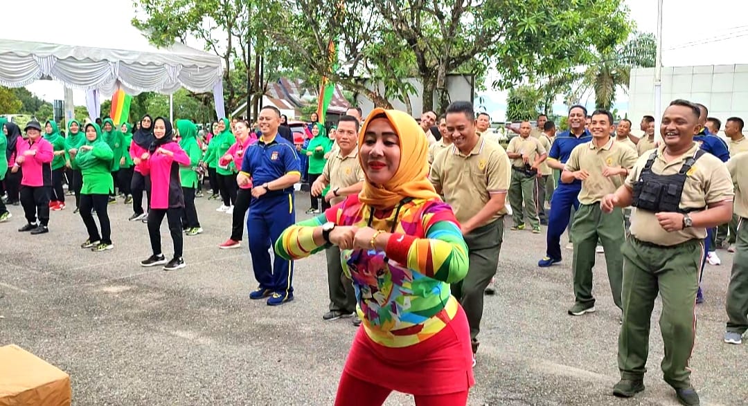 Selanjutnya, para personil TNI Polri melakukan senam yang dipimpin oleh Dewi dan crew serta pembawa acara Bhabinkamtibmas Polsek Rambah Brigadir Lisna Wati serta Briptu Selly Wahyuni.