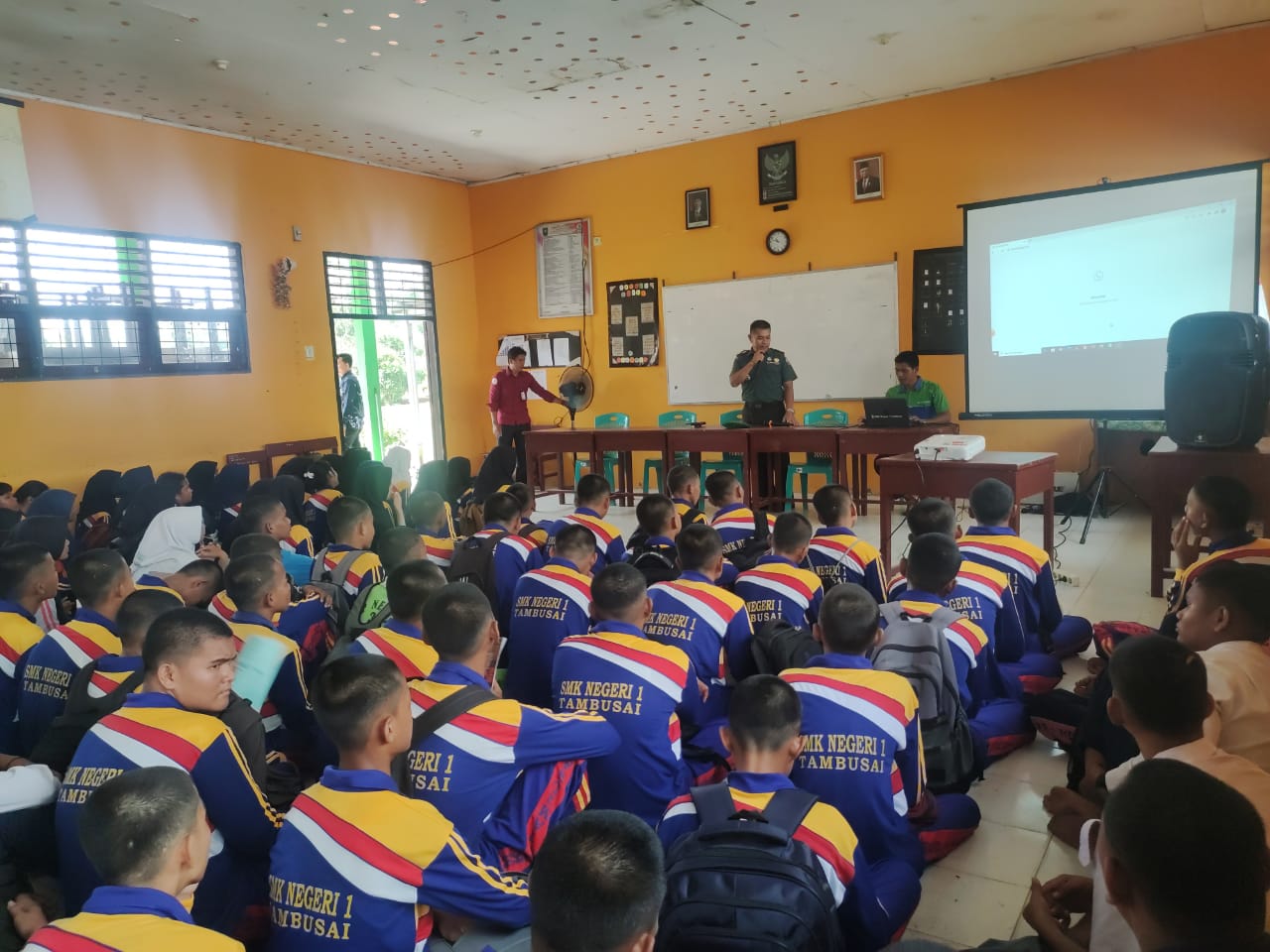 Rokan Hulu, reportaseindonesia.id | Dalam kegiatan Masa Pengenalan Lingkungan Sekolah tingkat Sekolah Menengah Kejuruan (SMK) di Kecamatan Tambusai Danramil beserta beberapa personel Babinsa Koramil 11/Tambusai kodim 0313/Kpr/Kapten Inf Lilik Haryono memberikan materi wawasan Kebangsaan (Wasbang) dan materi pelajaran Baris berbaris (PBB) bertempat di Aula SMK) N 1Tambusai Desa Talikumain Kecamatan Tambusai Kabupaten Rokan Hulu, Selasa (18/07/2023).