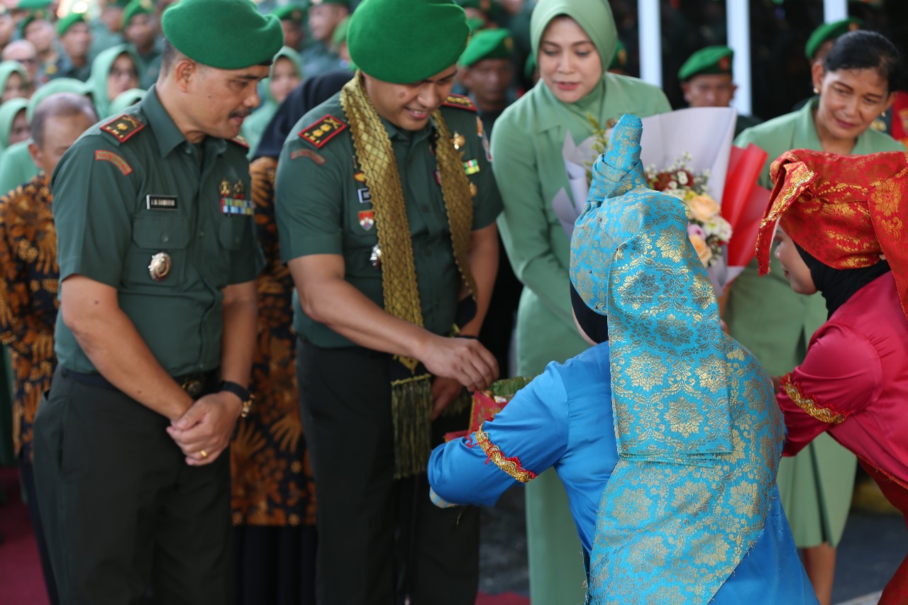 Kedatangan Letkol Inf Setiawan Hadi Nugroho S.H., M.I.P didampingi sang Istri Nyonya Megawati Tandjung Kemudian mereka dikalungkan songket khas Melayu dan disambut pertunjukan silat daerah serta diiringi tari persembahan tanda tamu kehormatan sebagai warga baru di keluarga Kodim 0313/KPR.