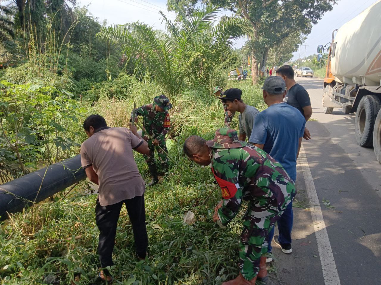 Kampar, reportaseindonesia.id |Dalam rangka menciptakan lingkungan yang bersih dan terjalin kebersamaan dalam bermasyarakat, Kapten Inf Devi Khairul Edward Danramil 16/Tapung Kodim 0313/Kpr bersama UPIKA Tapung dan warga masyarakat melaksanakan kegiatan karya bakti membersihkan ruas kanan kiri jalan dan parit di Jln. Petapahan-Flamboyan Desa Petapahan, Kecamatan Tapung, Kabupaten Kampar. Sabtu (12/01/2024).