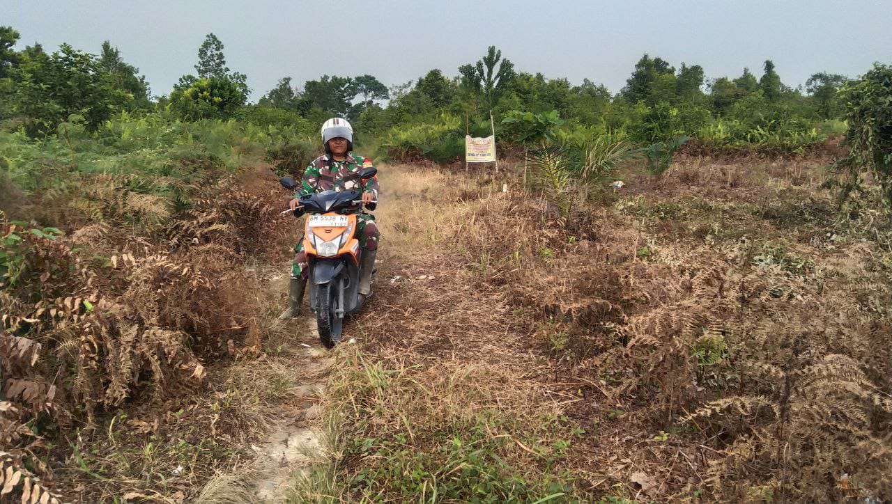 Serka Ayuwisafrizal salah satu Babinsa Koramil 07/Kampar yang rutin melaksanakan patroli Karlahut di wilayah binaannya Desa Tarai Bangun, Kecamatan Tambang, Kabupaten Kampar.