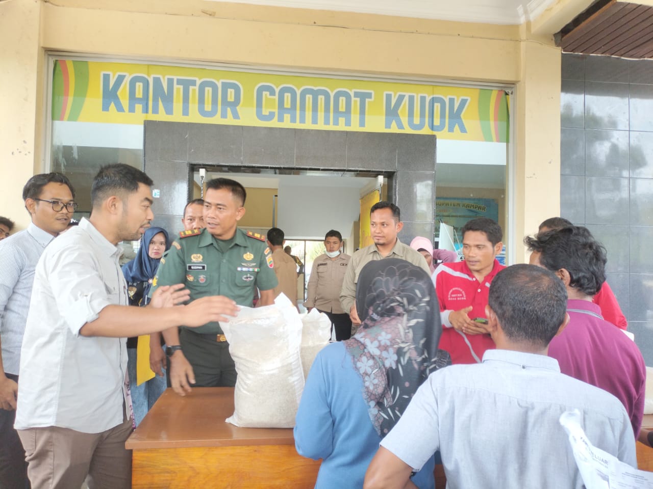 Lettu Arh Budiman saat saat monitor pembagian beras mengatakan saat ini sebanyak 2.221 warga kecamatan Kuok terdiri dari Desa Bukit melintang 233 Desa Empat Balai 286 Desa Kuok 677 Desa lereng 142 Desa Merangin 144 Desa jambu 354 Pulau tera 385/KK mendapatkan bantuan beras dengan masing-masing mendapatkan 20 Kg yang disalurkan langsung oleh Bulog