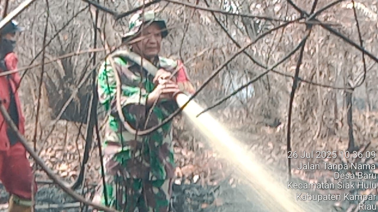 Rokan Hulu, reportaseindonesia.id |Dalam upaya mencegah kebakaran hutan dan lahan (karhutla) meluas, personel Babinsa Koramil 06 Siak Hulu, Kodim 0313/KPR Sertu Zulkifli Butar Butar bersama tim Manggala Agni terus melakukan proses pendinginan di lokasi lahan yang sebelumnya terbakar bertempat di Desa Baru, Kecamatan Siak Hulu, Kabupaten Kampar