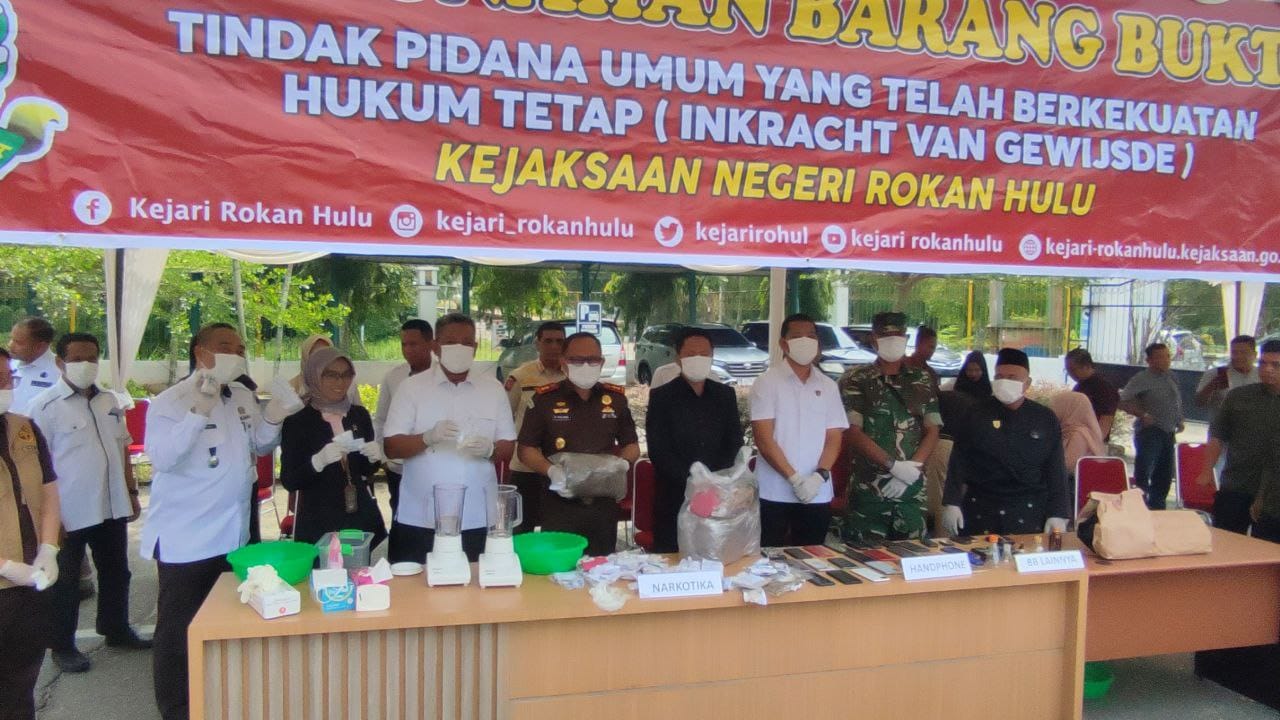 Rokan Hulu m, reportaseindonesia.id |Kejaksaan Negeri (Kejari) Kabupaten Rokan Hulu, Provinsi Riau memusnahkan berbagai barang bukti dari 3 perkara tindak pidana yang telah berkekuatan hukum tetap di halaman kantor Kejari Rohul yang ada di Desa Pematang Berangan, Kecamatan Rambah, Kabupaten Rokan Hulu, Rabu (24/9/2025) dan