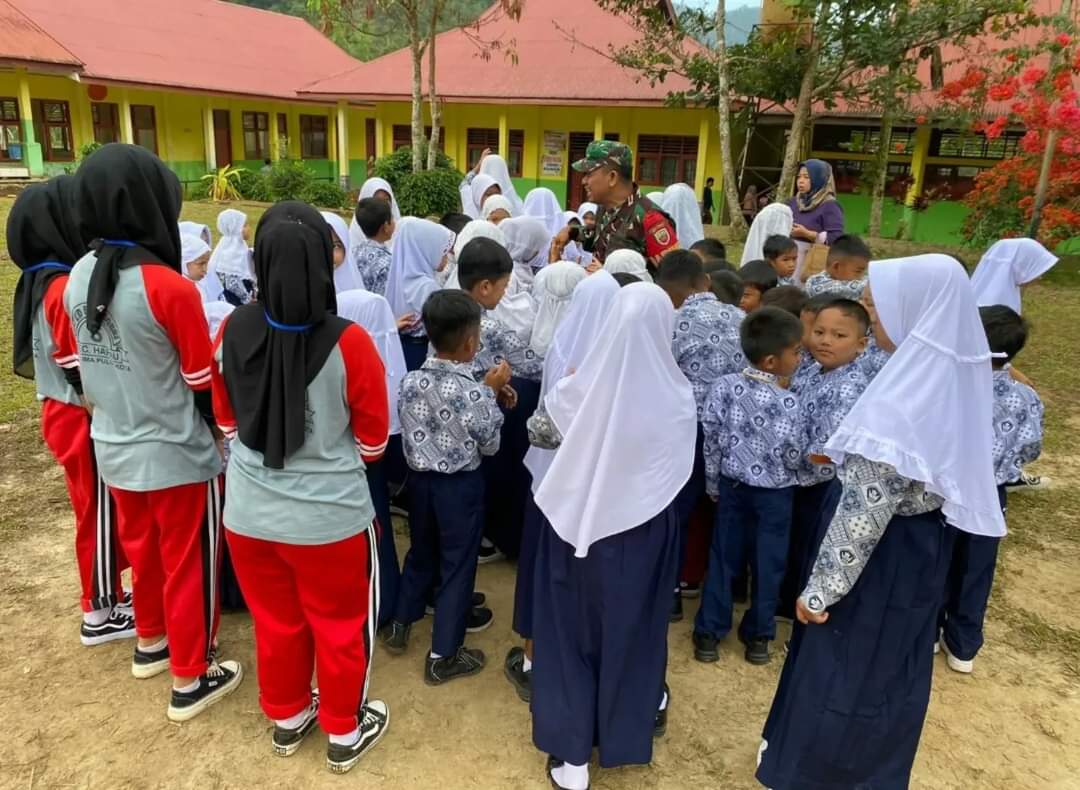 Kampar, reportaseindonesia.id |Babinsa Koramil 07/Kampar Kodim 0313/Kpr, Serma Aria Putra melaksanakan komsos dengan siswa SDN 001 yang berlokasi di wilayah Desa Bukit Keratai ,Kecamatan Rumbio Jaya, Kabupaten Kampar dan memberikan arahan tentang menjadi anak yang disiplin,Jumat (26/9/2025).