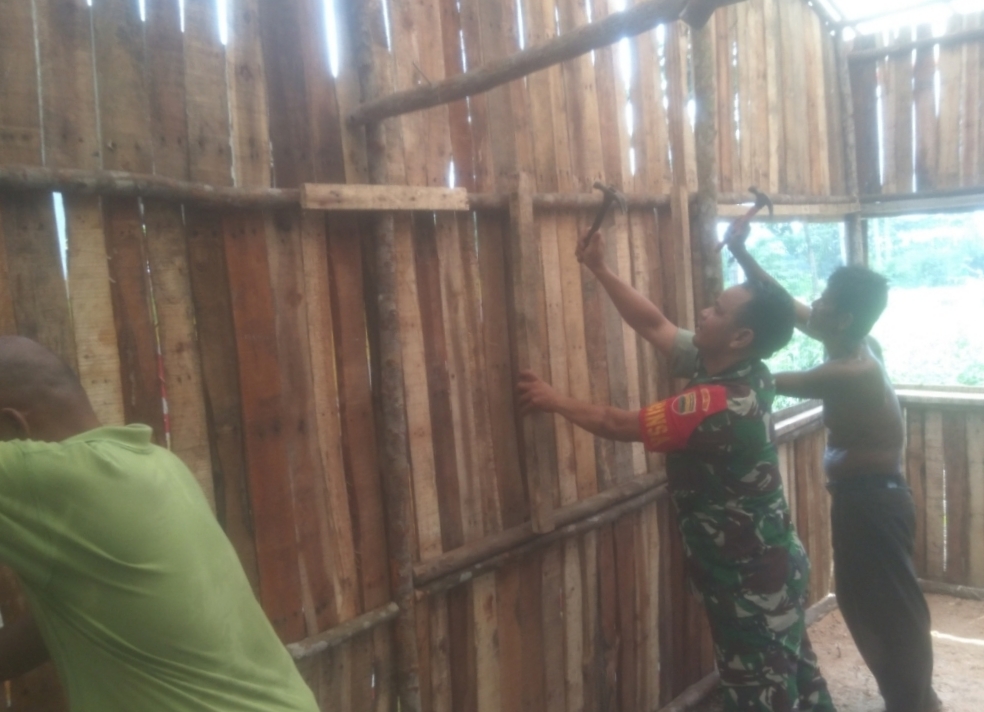 Ciptakan Sinergi TNI Bersama Rakyat, Babinsa Desa Rumbio Bantu Bangun Rumah Warga