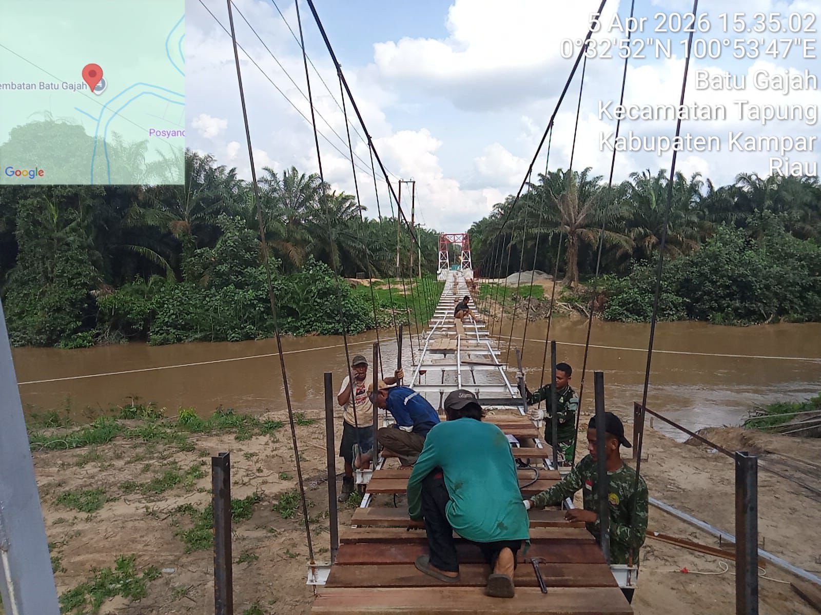 Kampar , reportaseindonesia.id |Pembangunan Jembatan Gantung Garuda Tahap II yang menghubungkan Desa Batu Gajah dan Desa Kusau Makmur, Kecamatan Tapung, terus menunjukkan akselerasi yang signifikan.(06/04/2026), proyek strategis Kodim 0313/KPR ini telah mencapai progres pengerjaan sebesar 79,25%.